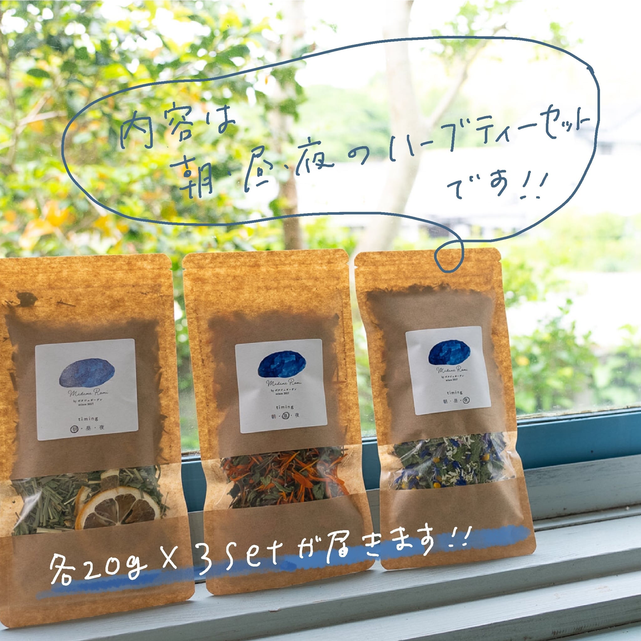 madameromiが自社農園・ポタジェガーデンから、毎月新鮮なハーブティーのセットが届く定期便です。